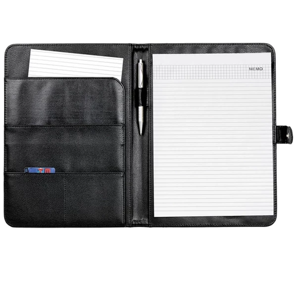 Wykonana z ekoskóry, czarna teczka wyposażona w kieszonkę na wizytówki - mieści 20 wizytówek, przegródkę na dokumenty oraz wkład papierowy A4(20 kartek). Kartka w linię. Długopis nie jest dołączony.